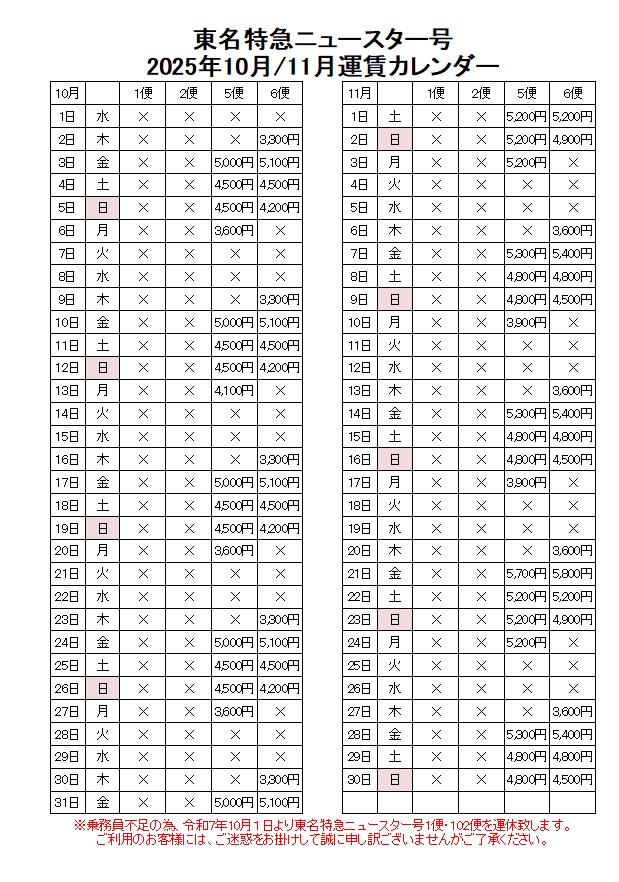 ※令和7年10月より、当面の間、東名特急ニュースター号1便・2便運休致します。