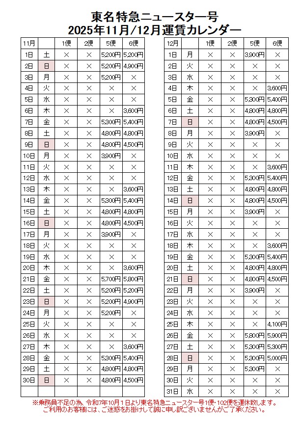 ※令和7年10月より、当面の間、東名特急ニュースター号1便・2便運休致します。