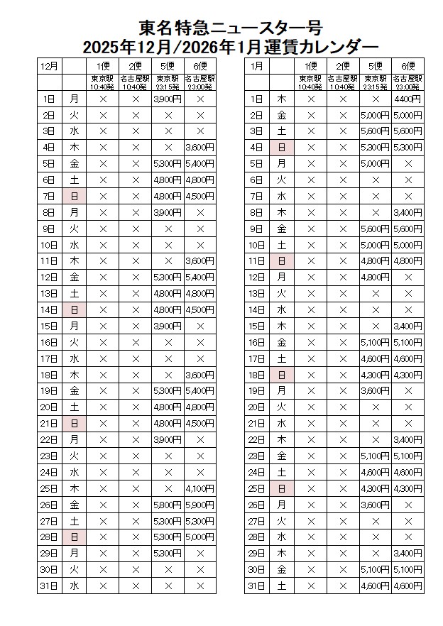 東名特急ニュースター号・羽田空港リムジン 1月運行予定