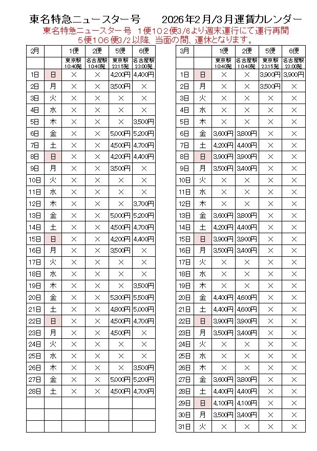 ※令和8年3月6日より、東名特急ニュースター号1便・2便を金・土・日・月曜日で運行再開いたします。
