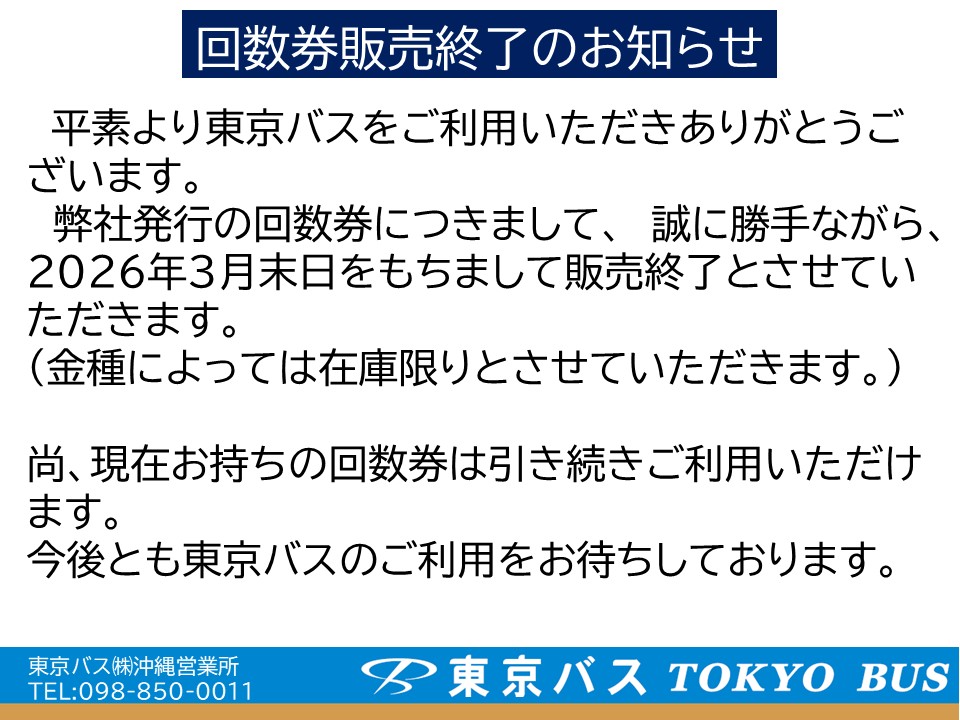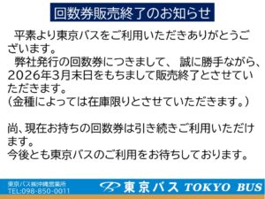 弊社発行の回数券につきまして、 誠に勝手ながら、 2026年3月末日をもちまして販売終了とさせていただきます。